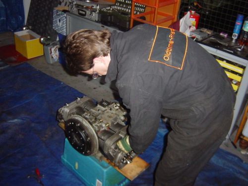 Nach dem Ventile einstellen wurde der Rumpfmotor komplettiert; Lichtmaschine, Anlasser, Verteiler, Öleinfüllvorrichtung wurden wieder montiert...Zu sehen auch die (schwarze) verstärkte Kennedy- Kupplung